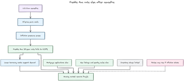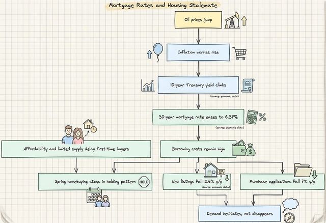 Freddie Mac says the average 30-year mortgage rate dipped to 6.37%, but borrowing costs still pressure the spring housing market.
